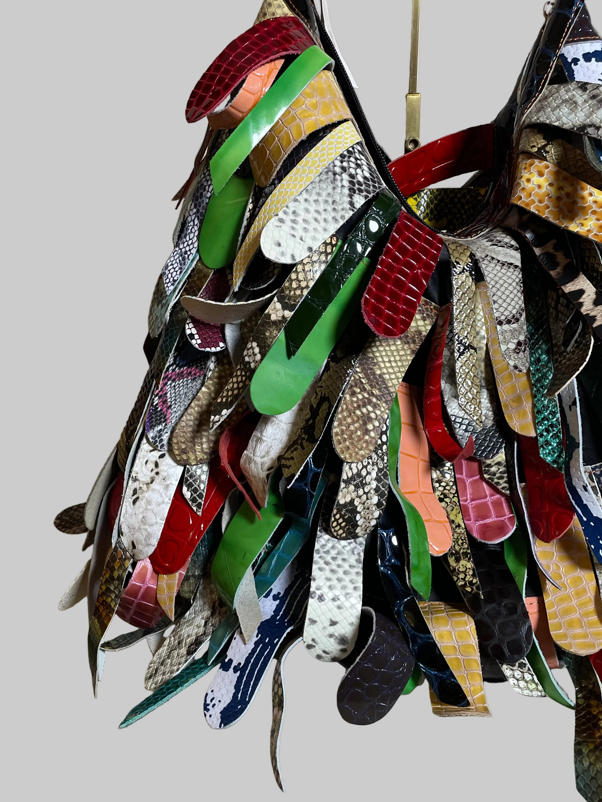 Patchwork color combinations and pattern placements vary by piece. Due to this artisanal production method, your bag's specific design composition may differ from the displayed imagery.
